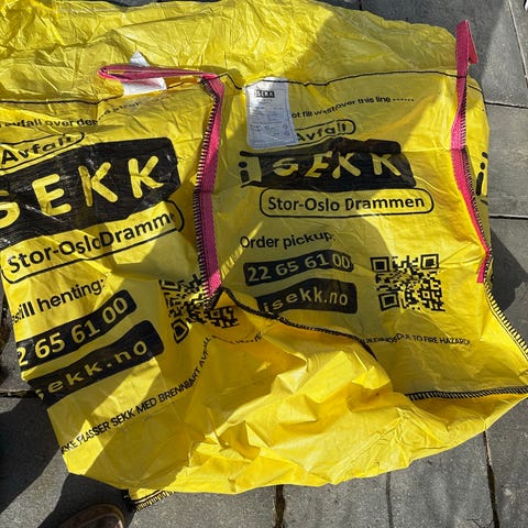 Avfalls sekk, såkalt Big Bag fra Norsk Gjenvinning. Fyll opp sekk og ring for henting.