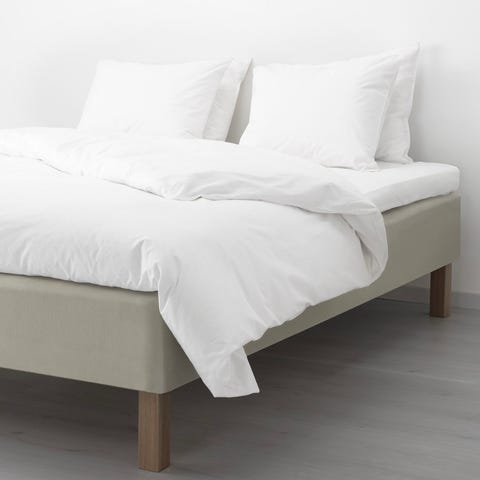 IKEA Snarum seng med Tussøy overmadrass. Sengen har en lys trekkfarge, og overmadrassen har hvitt trekk med strukturert overflate og gjennomgående sømmer. Passer som enkeltseng på soverom, gjesterom eller hybel. Overmadrassen gir et ekstra komfortlag over hovedmadrassen. Trekket på overmadrassen kan tas av for lufting og rengjøring etter behov.