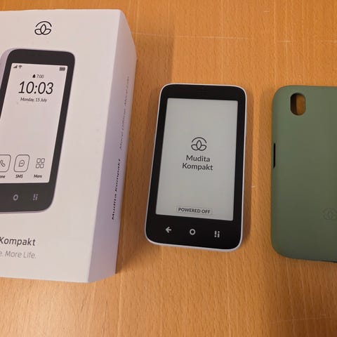 Sort Mudita Kompakt med blått deksel selges. Regner med de som er på jakt etter denne type telefon vet hvordan den virker.