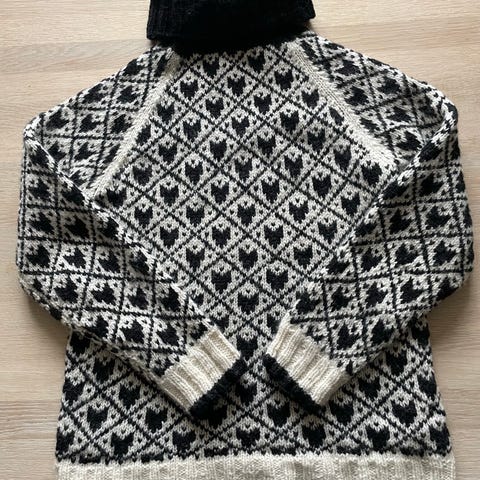 En romslig ullgenser, med litt lengde, i nydelig mønster og kvalitet! Grå og svart.