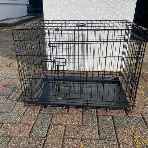 Hundebur i metall med svart overflate. Er blitt brukt til stor hund ( Rottwailer). Buret har gittervegger og -tak, samt uttakbart bunnbrett i plast/metall for enklere rengjøring. Egner seg til bruk hjemme, i bil eller som midlertidig oppbevaring av hund. Buret kan trolig slås sammen for lagring når det ikke er i bruk.