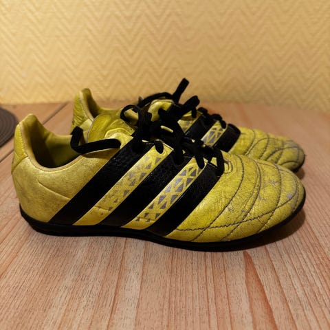 Adidas fotballsko i hvit farge med svarte striper og detaljer i gull. Fremstår nesten som nye. Bare kosmetiske små merker oppå. Ingen slitasje. Brukt kun få gangerr. Skoene har snøring og lav profil. Yttersålen er flat med mønster som gir grep på jevne underlag. Overdelen er i syntetisk materiale. Størrelse er merket US 8, UK 7,5, EU 41 ⅓, JP 260. Skoene brukes til fotball inne. Hallsko. Innesko.