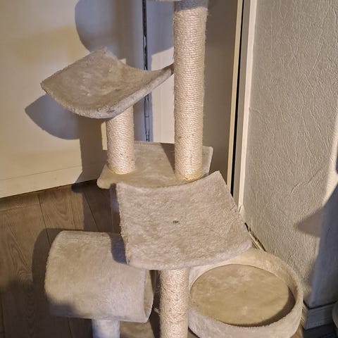 Klorestativ kattetre i brunt og hvitt med flere nivåer. Stativet har flere plattformer i ulike høyder, en hule, en rund liggeskål med myk kant, hengekøye og flere stolper med sisal til kloring. Egner seg for én eller flere katter som trenger klorestativ, liggeplasser og aktivitet innendørs.