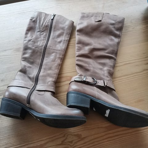 Helt nye ubrukt hvite støvler i størrelse 39 til dame fra Bibba selges veldig billig. De kostet 1899 kroner på skobutikk, men jeg selger dem for kun 600 kroner. Modellen er knelang med glidelås på siden og lav, bred hæl. Skoene er i en lys hvit-krem farge med dekorative remmer og metall-detaljer rundt ankelen. Innsiden av støvlettene er lett fôret (se bilder) for økt komfort og varme. Egner seg til bruk i overgangssesonger og mildere vinterdager. Passer til bryllup også.