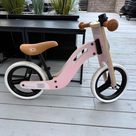 Støttehjul følger med. Det er påmontert en sak på høyre håndtak som lager motorsykkellyd når man vrir på den. Kan tas av.