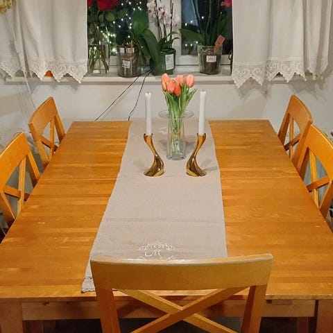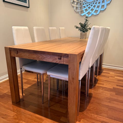 Solid spisegruppe i eik selges rimelig pga. flytting. Noe bruksmerker og slitasje, men når man oljer det litt så fremstår det mye nyere. Ileggplate for forlengelse medfølger også.