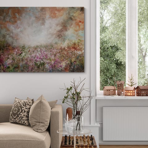 Maleri abstrakt blomster motiv på lerret i flerfargede toner. Bildet viser et detaljert og strukturert blomster- og naturmotiv med hovedvekt på røde, gylne og grønne nyanser. Detaljer i gull og glitrende effekt.