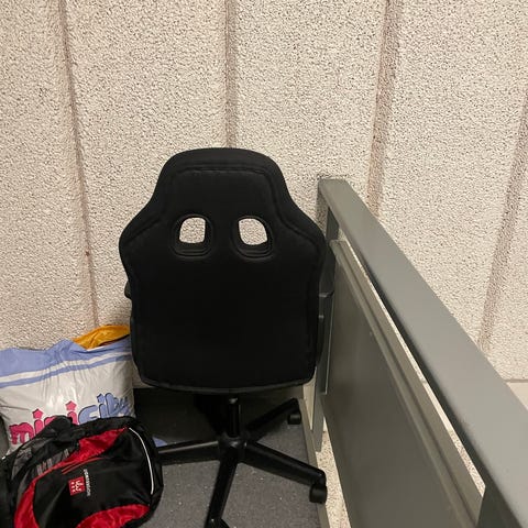 Stolen har komfortabelt sete, netting-rygg som gir god ventilasjon og armlener. Høyden kan justeres, og stolen har hjul.