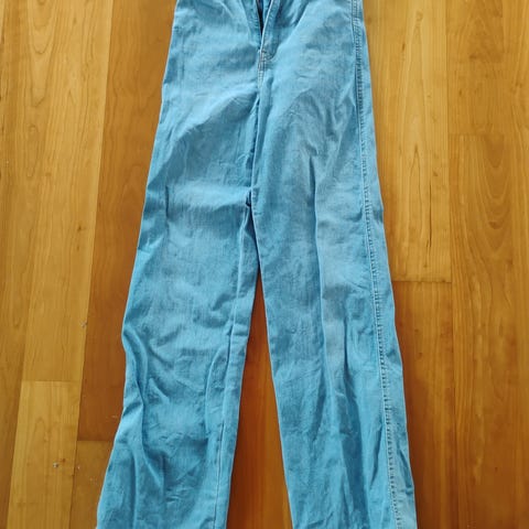 H&M Divided damejeans i blå denim. Buksen har størrelse 36. Klassisk 5-lommersmodell med beltehemper, knapp og glidelåslukking foran. Produsert i denim-materiale. Passer til hverdagsbruk og kan kombineres med ulike topper og gensere.