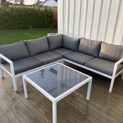 Hagesofa i hjørneløsning med grå puter i tekstil. Sofaen består av flere moduler som kan settes sammen til en hjørnesofa med sitteplass til flere personer. Rammen er i metall, og putene har avtakbare trekk. Noen av putene har synlige slitasjeskader og hull, som vist på bildene. Det mangler også en ryggpute, men fortsatt mye bruk igjen. Gis vekk pga flytting.