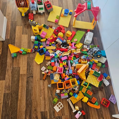 Vi selger en kasse med Lego Duplo av ulik årgang. Det meste er brukt av sønn på 21 år, noe kan være fra eldre søsken. Noe er kjøpt nytt til barnebarn. Blant annet en uåpnet eske som ikke ble tatt i bruk, fordi de gikk over til Lego