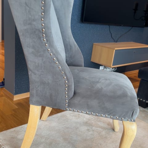 Litt av den øvre del av ryggen på stolene har fått litt fargeendring pga sol/lys, men ganske ubetydelig.