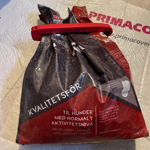 En sekk hundefor gis bort. Sekken er åpnet men det er bare tatt ut nok til et par foringer.