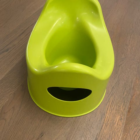 Rosa potte i plast for små barn. Potten har ryggstøtte og håndtak på siden. . Åpninger i siden gjør det lettere å løfte og tømme potten.