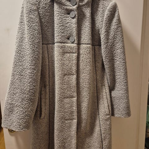 Jacqueline de Yong ullkåpe for dame i størrelse M. Lang grå kåpe i ullmateriale med klassisk krage og knappelukking i front. Kåpen har lange ermer og stikklommer i sidene. Egnet som yttertøy i kjøligere vær. Str 40, en liten innsving i livet.