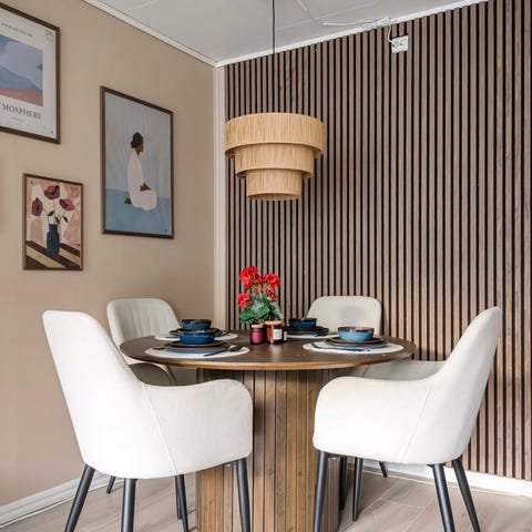 Jysk spisebord med stoler i moderne, rund utførelse. Spisebordet har hvit, rund bordplate med søylefot. Medfølgende stoler har polstret sete og rygg i lys beige tekstil med ben i lys farge. Passer som spisegruppe på kjøkken eller i liten spisestue, og gir sitteplass til fire personer rundt bordet.