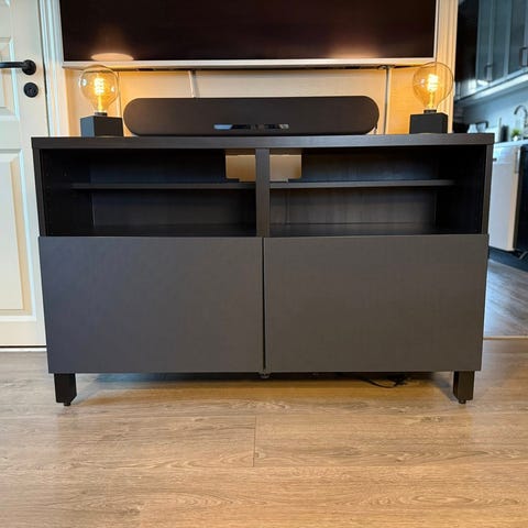 Pent brukt, svart tvbenk med skyvedører. Det er et merke på topplata , se bilde 4. Det er mer synlig på bilde enn i virkeligheten.