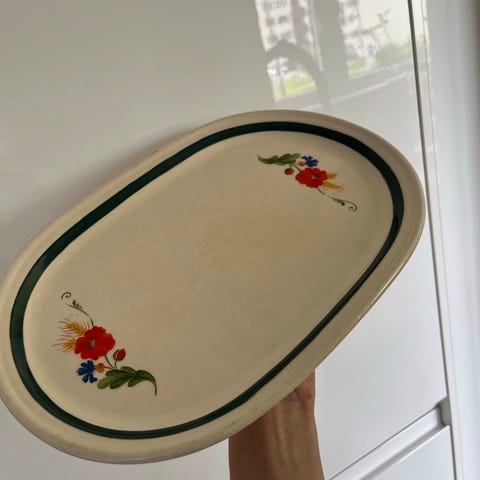 Pent og klassisk ovalt serveringsfat fra Friesland, Germany, dekorert med små hvite blomster og grønn ranke langs kanten. Tidløst og lyst uttrykk som passer perfekt til både hverdag og selskap.
