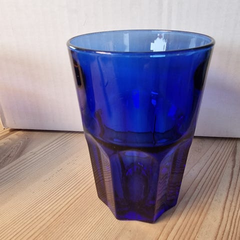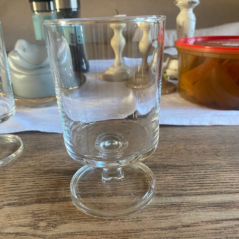 Arcoroc vintages glass på stett i grønt glass med klar fot. Glasset har sylinderformet klokke og kort stett. Laget på 70-tallet.