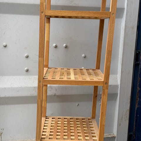 Bambus stige i naturfarget tre. Stigen har avrundet topp og flere trinn, egnet som dekorativ innredningsdetalj, for eksempel til oppheng av håndklær eller klær. Passer i ulike rom som bad, soverom eller stue.