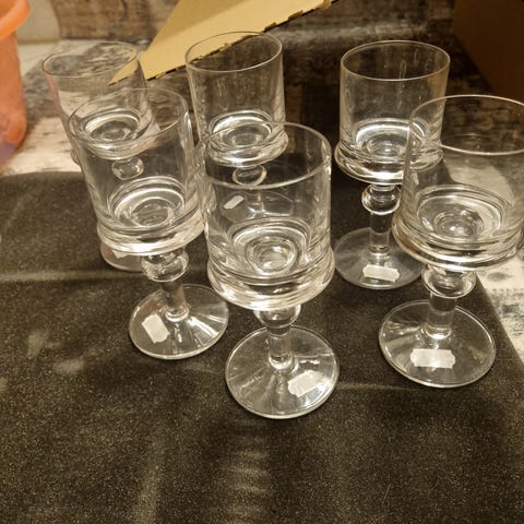 Glass på stett i klart glass. Klassisk, rett form med kort stett og rund fot. Passer til servering av vann, juice eller andre kalde drikker ved borddekking til hverdag og selskap. Kan også brukes til diverse desserter, gelé, ostekake i porsjoner, puddinger osv. 6 stk og selger de samlet for 100,-