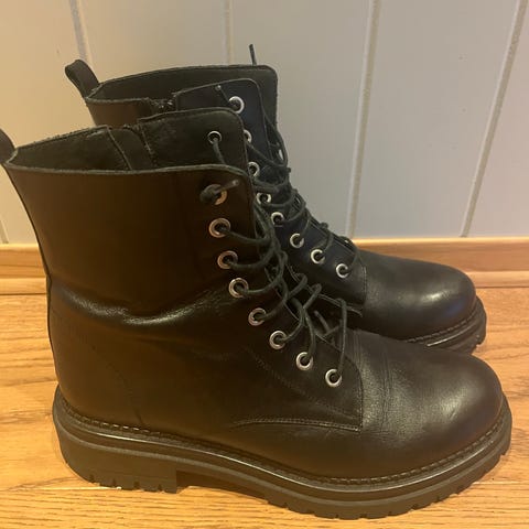 Tamaris vinterstøvler i størrelse 41. Modellen er en svart snørestøvel med glidelås på innsiden for enklere av- og påtaking. Overdelen er i glatt skinn, med enkel sømdetalj rundt lissepartiet. Sålen har lett profil for bedre grep, og en markert kant i kontrastfarge mellom overdel og yttersåle. Støvlene passer til hverdagsbruk i den kaldere årstiden.