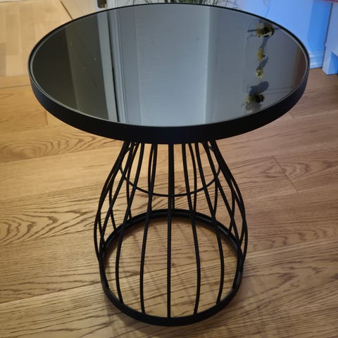 IKEA sofabord i metal, bordet har rundt brett som bordplate og underdel i metall stativ med oppbevarings mulighet.