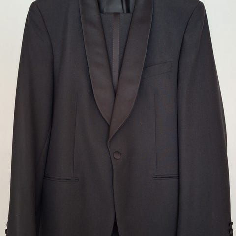 J. Lindeberg smoking for herre i størrelse M. Jakken er svart og laget i bomull. Den har sjalskrage med blankt stoff, en knapp i front, brystlomme samt frontlommer med klaff. Innvendig finnes flere lommer og helfôret innsiden. Moderne passform og høy kvalitet på materialer. Passer som penjakke eller del av dress til formelle anledninger.