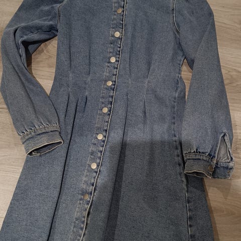Selger en fin dongerikjole i str M. Den har knapper, knytebelte og fine detaljer. Kjolen er pent brukt.