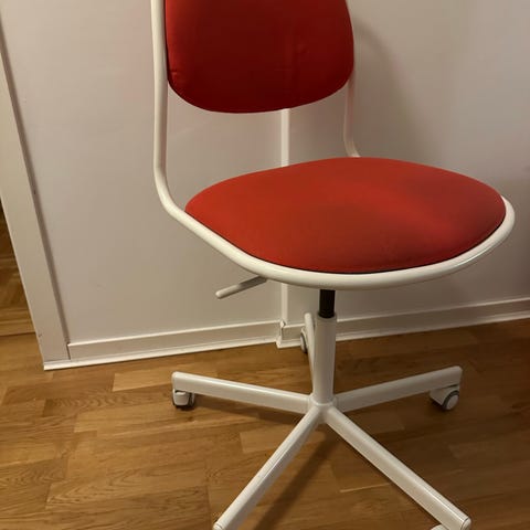 IKEA kontorstol i rød tekstil med polstret sete, rygg og armlener. Stolen har dreibar fot med hjul og understell i lys/grått metall eller metallfinish. Høyden på setet kan justeres med hendel under setet. Egnet som kontorstol eller arbeidsstol ved skrivebord i hjemmekontor eller kontormiljø. Stolene seges samlet for kr. 100,-
