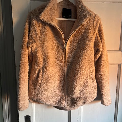 ONLY jakke for dame i størrelse XL. Jakken er beige og laget i polyester med teddy-/fuskepelsstruktur. Den har høy krage, glidelåslukking foran og lommer i sidene. Kontrastbånd i mørk farge markerer sømmene. Passer som ytterjakke i overgangssesonger eller på kjølige dager.