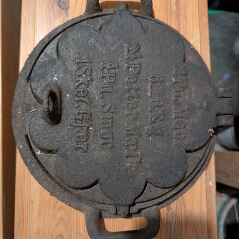 Gammeldagse vaffeljern og kjøkkenredskaper i støpejern og tre
