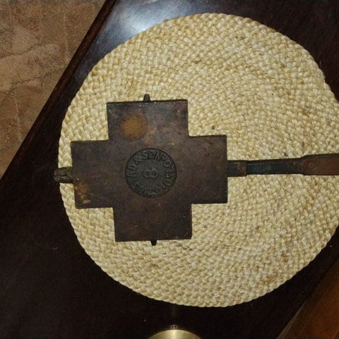 Samling med eldre kjøkkenredskaper, hovedsakelig i støpejern og tre. Bildene viser blant annet flere gammeldagse vaffeljern i støpejern med hjerteformede plater og dekorert mønster, samt ulike treverktøy og redskaper, en manuell kjøttkvern i metall og andre eldre kjøkken- og håndverksgjenstander. Egner seg som bruksgjenstander for den som ønsker tradisjonelt utstyr, eller som dekorative objekter i kjøkken, hytte eller verksted. Detaljer om antall og eksakte mål fremgår ikke av bildene og bør eventuelt avklares med selger.