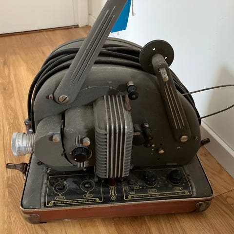 har en gammel filmfremviser. har aldri testet den, mangler noe på den, vet ikke om det kan fikses, den er fra 30 tallet. men fin som utstilling eller noe, pynt kanskje? følger med olje og noe papirer. ser ut som originalt. kan sendes mot porto. veier litt. OBS ER IKKE 230 VOLT. så må eventuelt ha noe i mellom hvis det skal testes, eller en strømomformer av noe slag. ingen garanti for noe hvis testes. tror det er en 8mm filmfremviser. når det blir 2032 så er denne 100år .