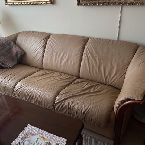 2 stk skinn sofaer 3+2 selges, helst samlet . Beige farge. Lengde: 3 seter 190 cm/ lengde: 2 seter 130 cm. Noe slitt i sete men ellers ok,