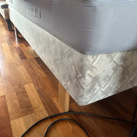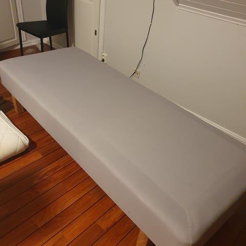 IKEA seng med uttrekk og to liggeflater. Sengen har overmadrass med rutete trekk og underliggende madrass med ensfarget trekk. Uttrekksdelen gir ekstra soveplass ved behov. Egner seg som seng eller sofa på barnerom, gjesterom eller i mindre rom der det er behov for fleksibel bruk av plassen.