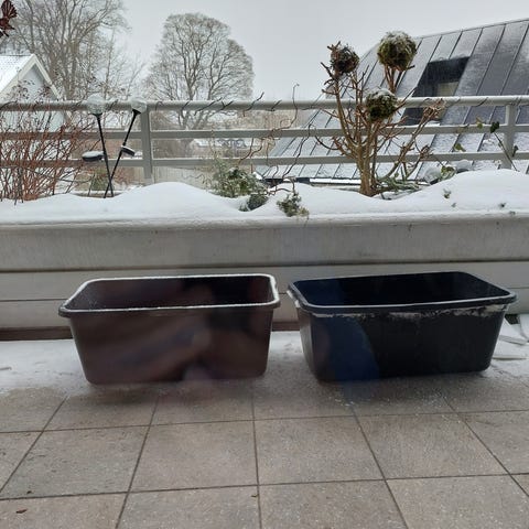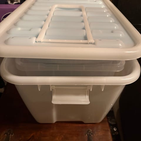 Plastkasser med lokk i hvit farge. Kassene er stablebare og egner seg til oppbevaring av klær, leker, utstyr eller andre gjenstander. Praktisk løsning for organisering i bod, garderobe eller andre rom der det er behov for ekstra lagringsplass.