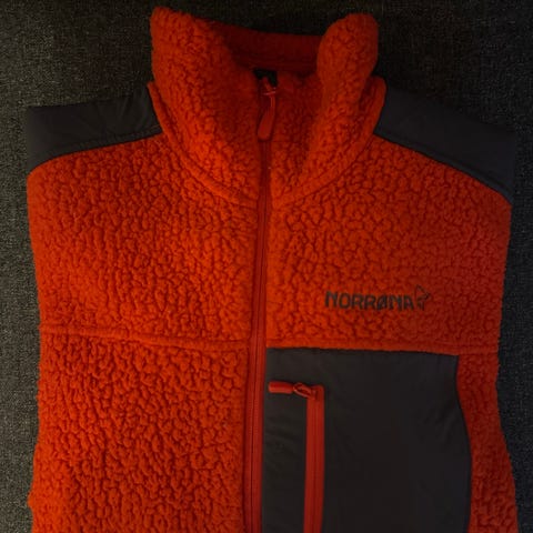Norrøna fleecejakke for herre i størrelse XL. Jakken er i lys farge med mørke kontrastfelt på skuldre og brystlomme. Modellen har hel glidelås i front, høy krage og en brystlomme med glidelås. Mykt, teksturert fleecemateriale gir god varme og komfort. Egnet som mellomlag eller ytterlag ved mildere vær, til hverdagsbruk og ulike friluftsaktiviteter.