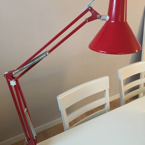 HCF skrivebordslampe. Fin i lakken, men har vært lagret i mange år slik at særlig hvite plastdeler er støvete. Fjærene ser fine ut.