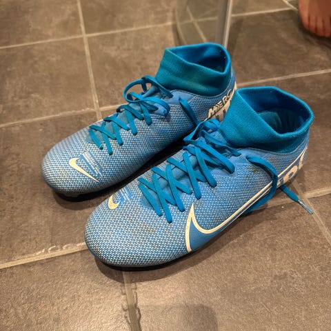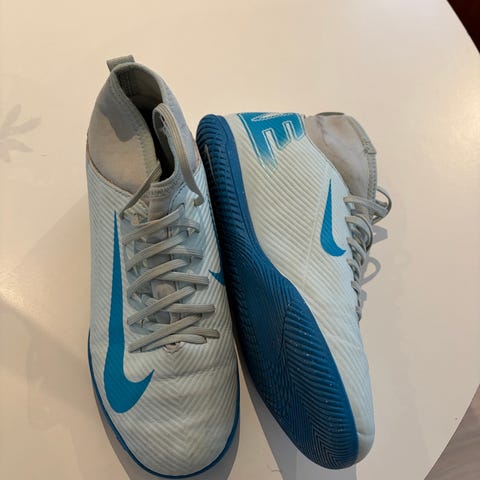 Nike fotballsko med grå og blå overdel med mønster og oransje Nike-logo. Modellen har sokkekrage rundt ankelen for tettere passform og lisser for justering. Yttersålen er blå med hvite knotter til bruk på gressbane. Egnet som fotballsko til trening og kamp.