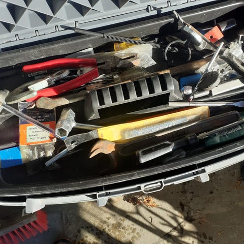 Diverse verktøy og tilbehør samlet i en trekasse. Inneholder blant annet håndverktøy som skrutrekkere, tenger, filer, småsager, kniver og meisler, samt ulike kabler, ledninger og mindre elektriske komponenter. Det følger også med en del smådeler som skruer, muttere og beslag. Egnet som blandet verktøysamling for generelt vedlikehold, reparasjoner og hobbyarbeid i garasje, verksted eller hjemmemiljø.