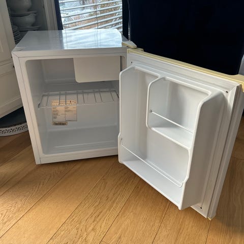 Kjøleskapet har flere justerbare trådhyller og en grønnsaksskuff nederst. I døren er det flere hyller for oppbevaring av flasker og mindre varer. Passer som frittstående kjøleskap på kjøkken, hybel eller kontor. Døren er hengslet på høyre side slik det vises på bildene.