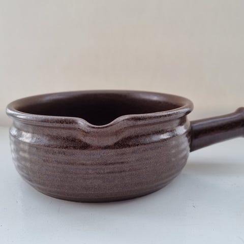 Fin liten serveringsgryte fra britiske Sylvac, ca. 1950–60-tallet.Brun glasur utvendig og lys innside, med praktisk tut og solid håndtak.
