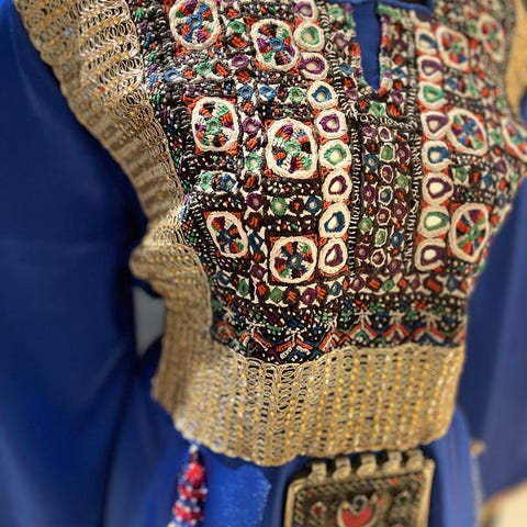 Afghansk kjole & Other Stories kjole til spesiell anledning i chiffon, one size. Kjolen har flerfargede detaljer med rød dekorert overdel og hvit, fotsid skjørtedel. Lange, vide ermer i lett og gjennomsiktig chiffon gir et luftig uttrykk. Midjen markeres med beltepreg og dekorative elementer. Passer som kjole til spesielle anledninger for kvinner, i én størrelse som er ment å passe flere kroppstyper innenfor one size-området.