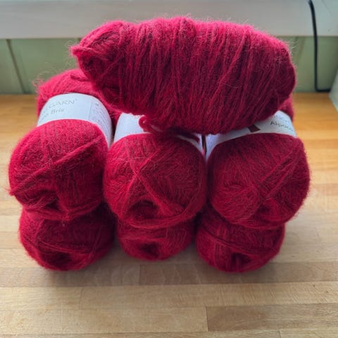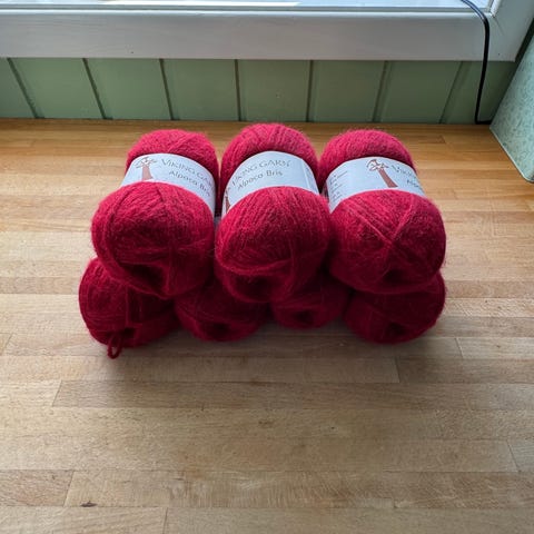 10 nøster med samme innfarging, kun strikket prøvelapp av det ene nøstet (44gr igjen på det)