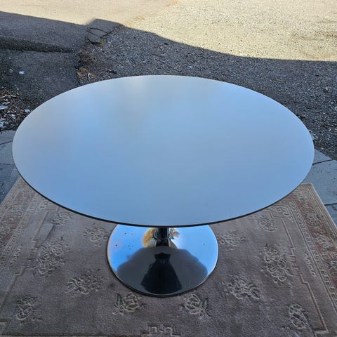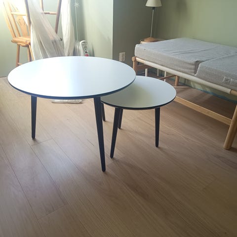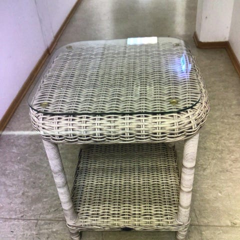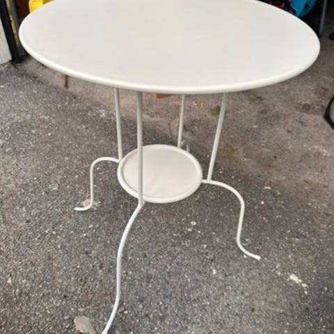 Rundt bord i hvit/naturgrå rotting. Bordet har flettet bordplate og underhylle med kryssmønster som gir et lett og luftig uttrykk. Godt egnet som lite spisebord, hagebord eller balkongbord, f.eks. Ble dessverre akkurat for stort for den lille balkongen vår. Diameteren er ca. 60cm. Kan sees/hentes på Minde.