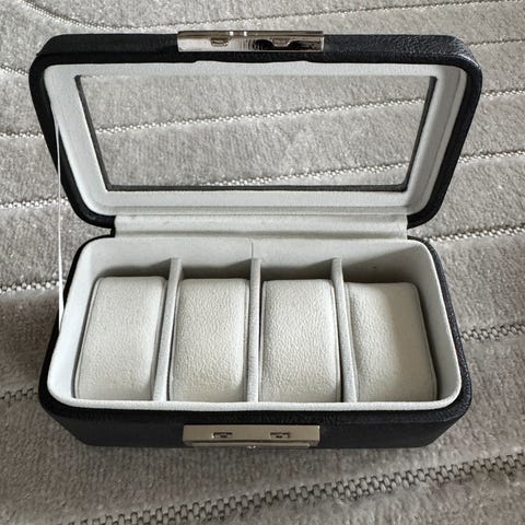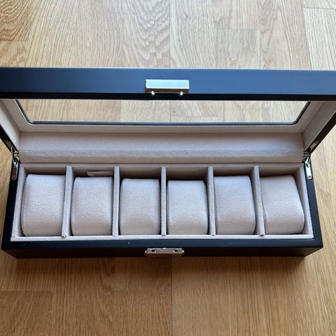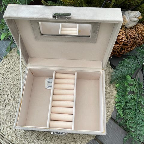 Klokke skrin i velur, bredde 30cm, dybde 10cm.