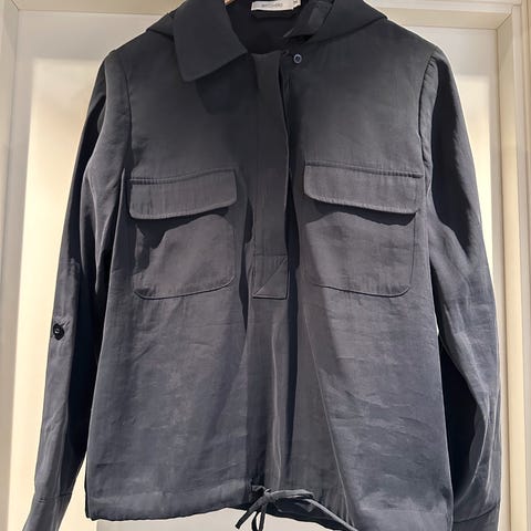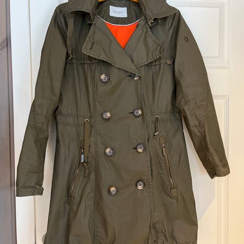 Den har glidelåslukking foran kombinert med knapper, justerbar snøring i livet og flere lommer foran. Innsiden har glatt fôr i kontrastfarge.
