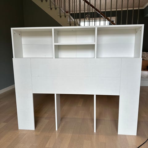 Passer som ryggstøtte bak seng og kan plasseres inntil vegg. Egnet for soverom der man ønsker kombinert sengegavl og oppbevaringsløsning. Brukt til seng 180x200