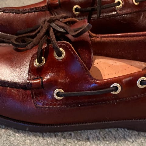 Selger et par klassiske Timberland båtsko i mørkebrunt skinn.
